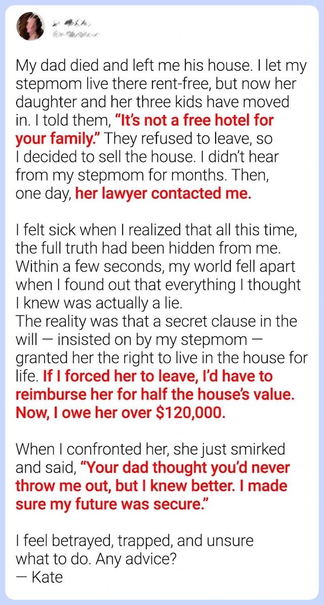 One day, Kate received a phone call from her stepmother’s lawyer, and what she learned in that call left her stunned. Kate found out that her father’s will contained a secret clause that her stepmother had insisted on. This clause granted her stepmother the right to live in the house for the rest of her life, rent-free. Not only was Kate not able to sell the house as she had planned, but she also discovered that if she forced her stepmother to leave, she would be obligated to pay her stepmother half of the house’s value — a sum of over $120,000.